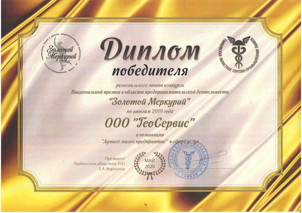 ООО «ГеоСервис» стало победителем регионального конкурса Национальной премии в области предпринимательской деятельности «Золотой Меркурий» по итогам 2019 г. в номинации «Лучшее малое предприятие» в сфере услуг.